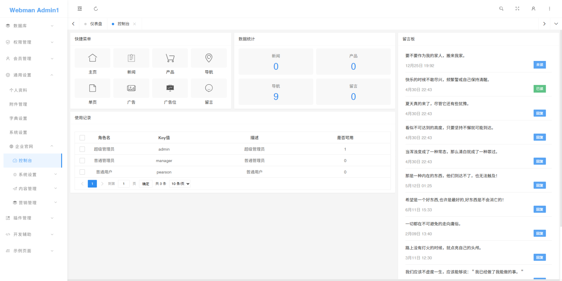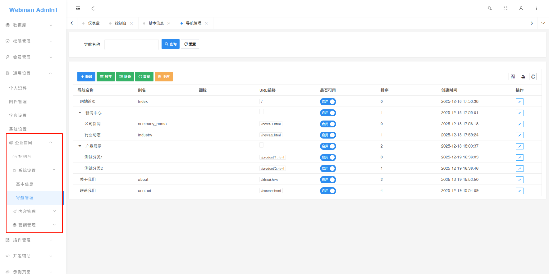 本应用基于WebmanAdmin+LayUI开发,采用模块化设计,集成了丰富的内容管理和展示功能。系统涵盖文章管理、产品展示、广告投放、导航菜单配置、单页内容管理和用户留言反馈等模块,适用于企业官网建设与运营。
