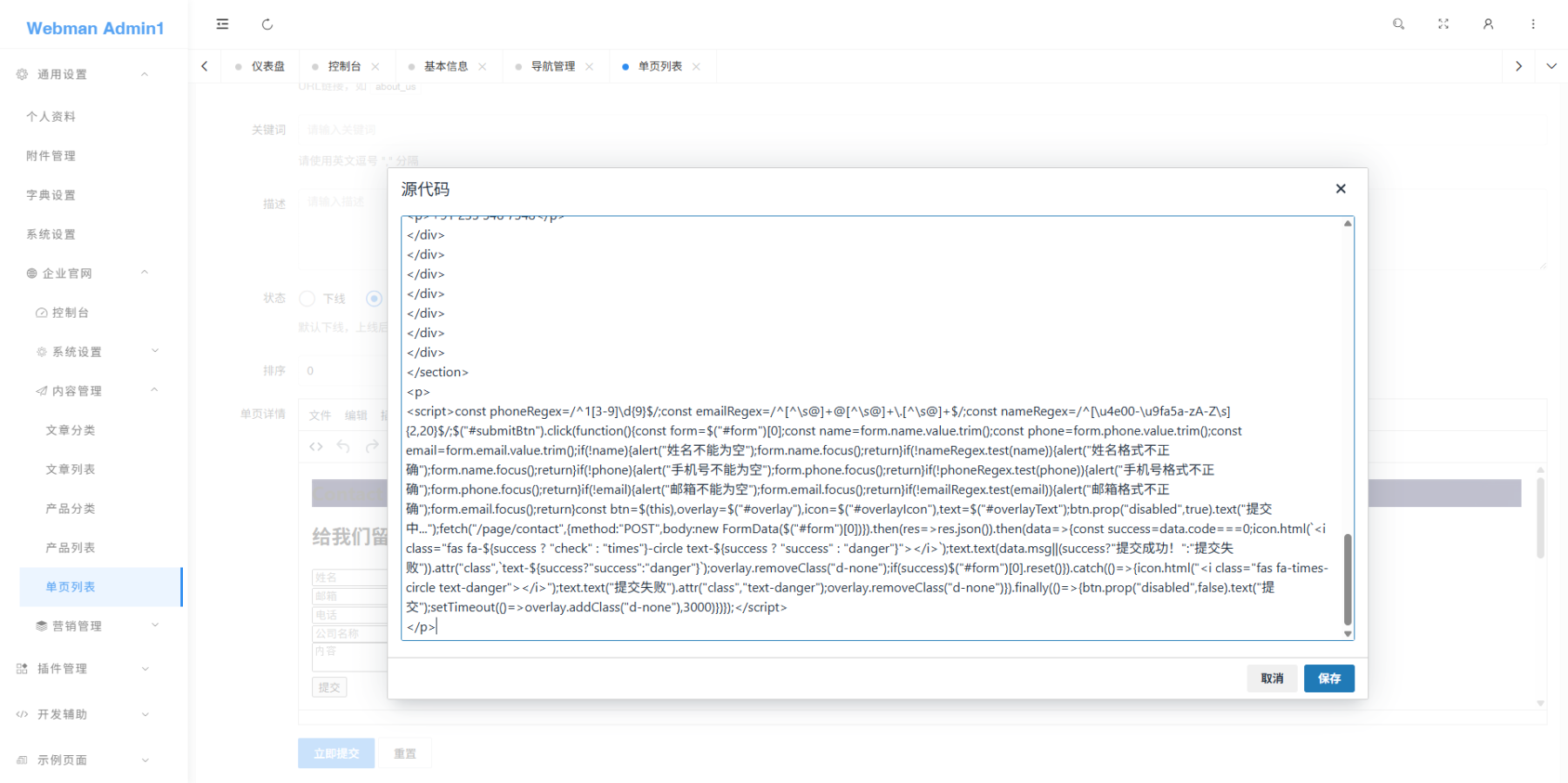 - 支持独立单页内容管理,如“关于我们”、“联系我们”页面,包含标题、关键词、描述及正文内容。