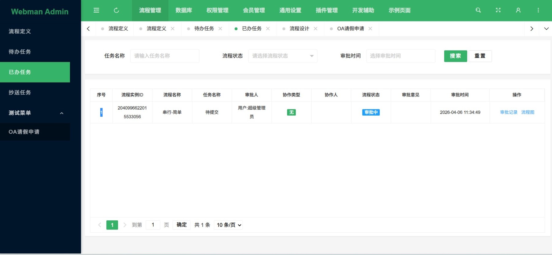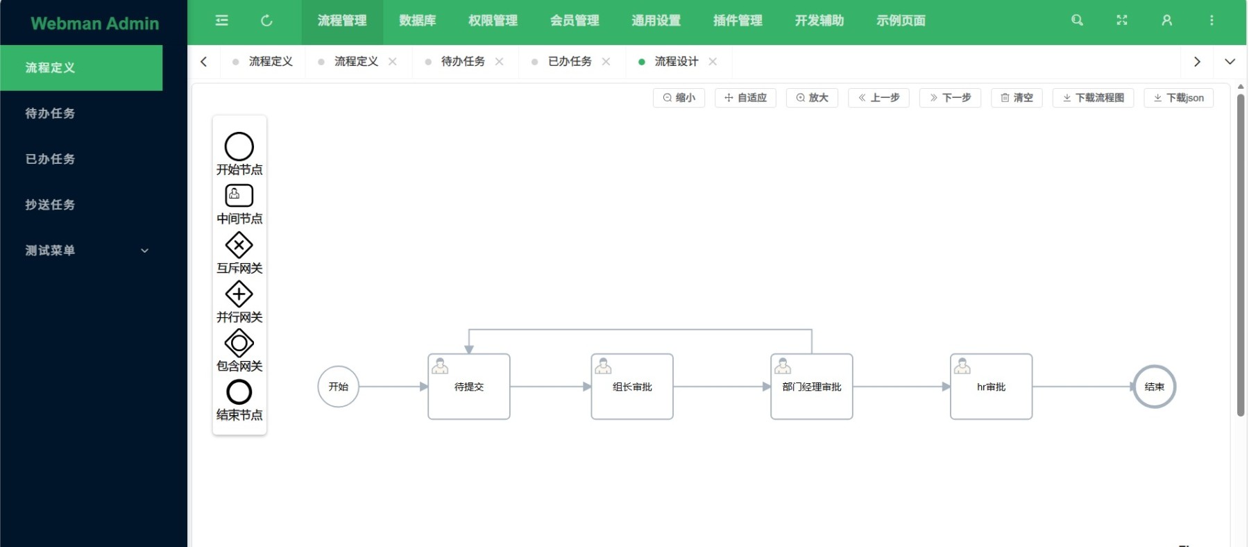 内置了一个简单的串行的流程定义json文件,位于 插件目录下/测试流程json/leaveFlow-serial1.json,可以在流程定左上角导入.