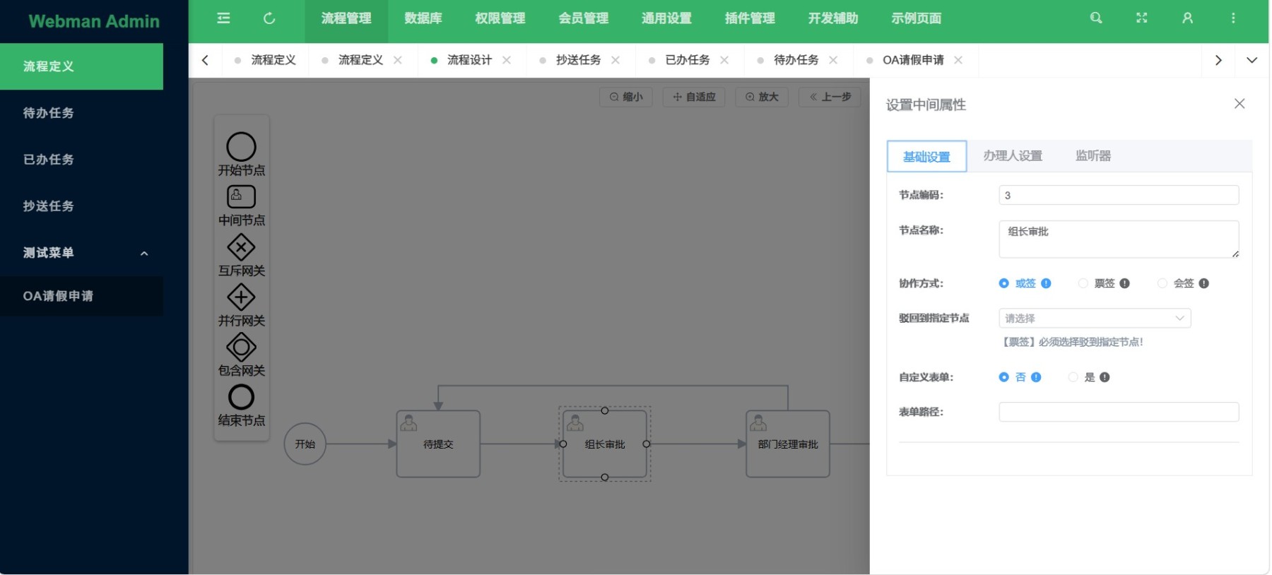 流程设计器:支持节点属性扩展,原生支持经典和仿钉钉双模式。