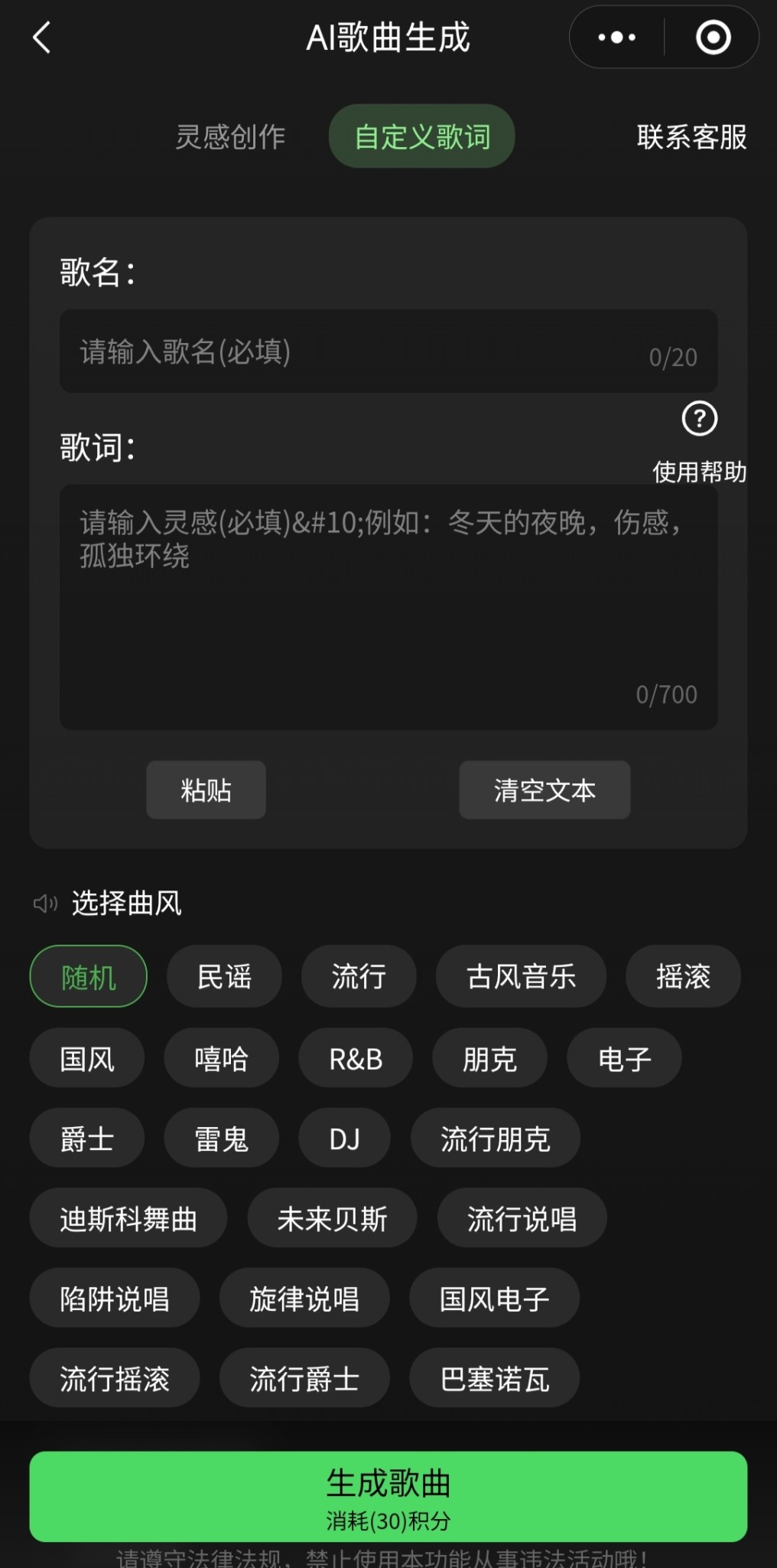 2、一键写歌: 用户可通过灵感或者自定义歌词的方式一键创作歌曲。
