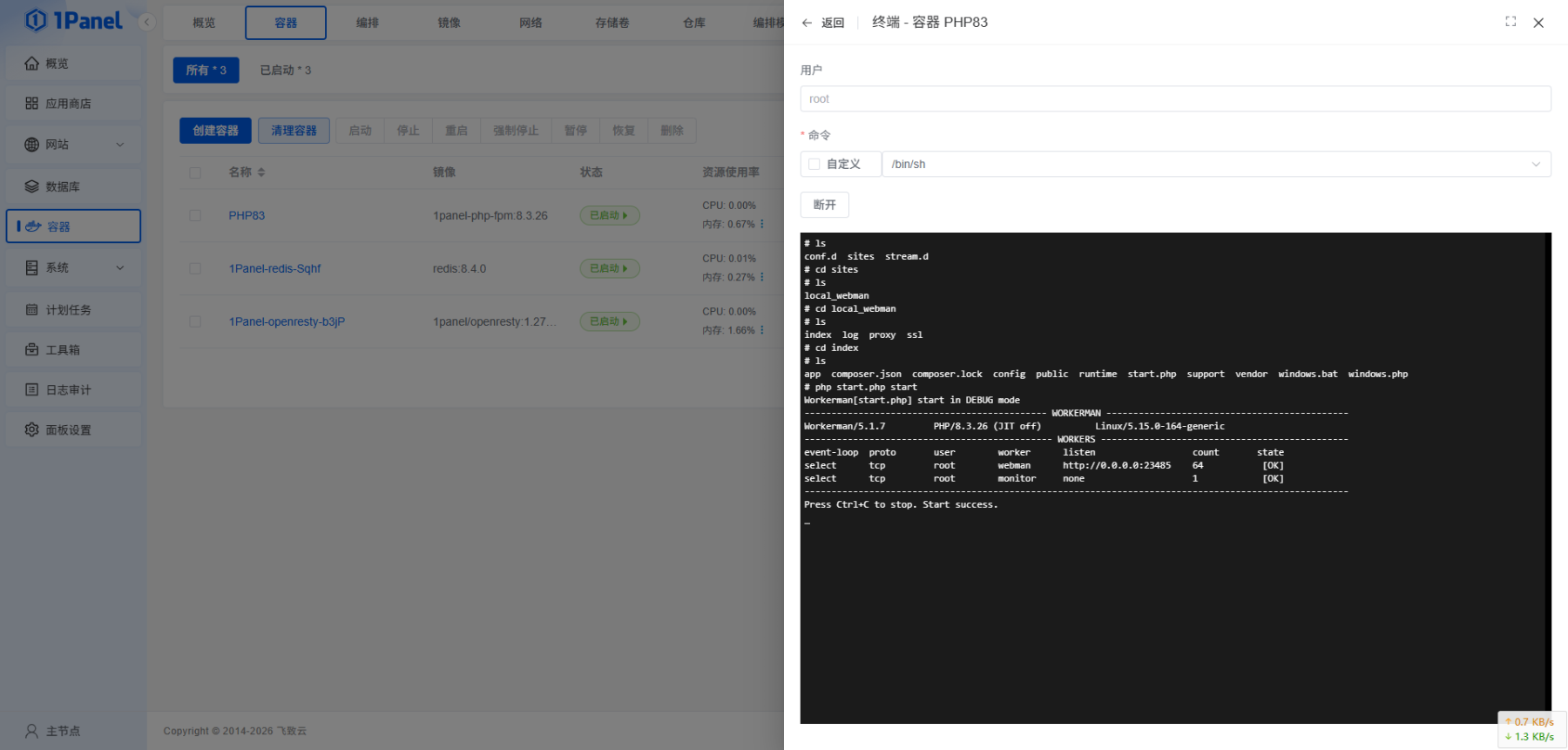 6、进入PHP容器,在终端执行:php start.php start 启动Webman
