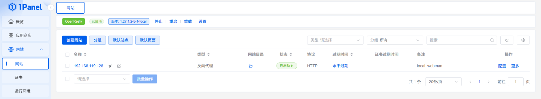 4、创建一个网站,绑定域名:192.168.119.128,类型:反向代理,代理地址:http://0.0.0.0:23485