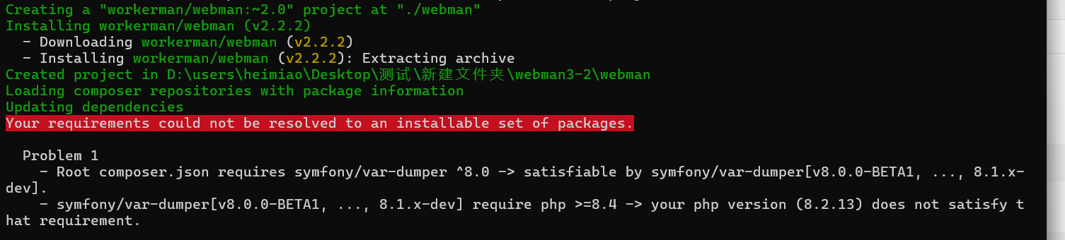 问题描述 composer create-project workerman/webman:~2.0 直接新建项目。软件包只有 "php": ">=8.1", "workerman/webman-framework": "^2.1", "monolog/monolog": "^2.0" 但是升...