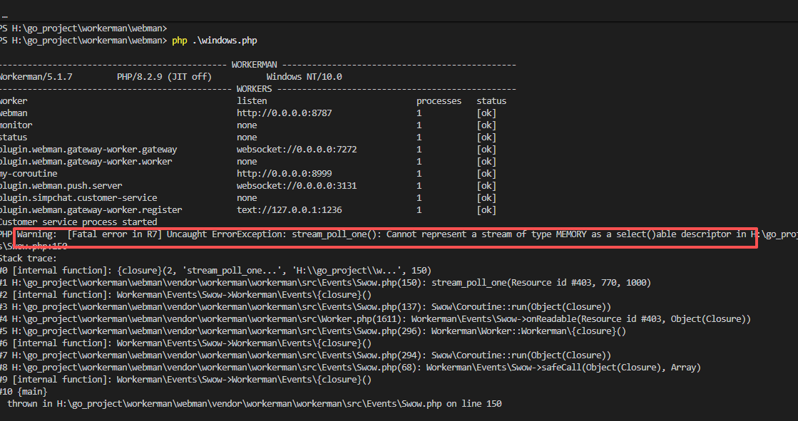 问题描述 https://github.com/walkor/workerman/issues/1128 https://github.com/walkor/workerman/pull/1129 上面的合并在window环境下会导致协程无法使用,没有修改代码之前使用fopen(__FILE__, 'r'),在windows下代码运行是可以正常运行的, 合并以后变成了fopen('php://memory', 'r'...