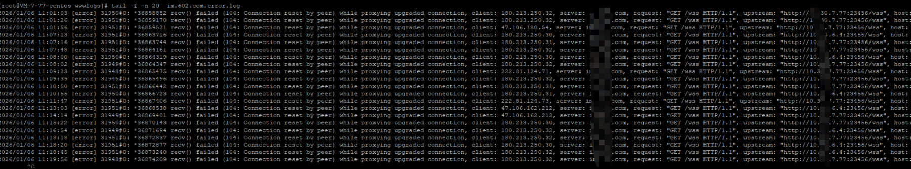 Nginx 代理 Gateway recv() failed (104: Connection reset by peer) 这里写问题描述 平常同时在线3w + 左右的流量 2026/01/06 11:01:03 [error] 31950#0: *36858852 recv() failed (104: Connection reset by peer) while proxying upgraded con...